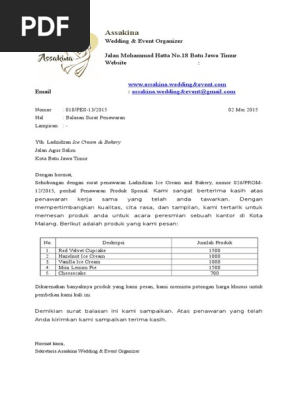 Contoh Surat Balasan Penawaran Produk Dalam Bahasa Inggris Contoh Surat from tse2.mm.bing.net Surat permintaan seringkali dipergunakan oleh suatu cabang perusahaan ke kantor pusat. Surat ini juga sering dipergunakan oleh suatu bidang atau departemen di dalam suatu perusahaan untuk meminta barang, seperti barang inventaris dari departemen sarana. Contoh balasan surat penawaran pembelian produk. Pada umumnya tujuan surat penawaran ialah untuk menawarkan atau memberikan penjelasan tentang suatu produk kepada pihak lain, baik itu barang ataupun jasa, dan di dalam surat tersebut menjelaskan tentang spesifikasi dari. Surat balasan kerjasama merupakan salah satu contoh surat resmi yang dikeluarkan oleh perusahaan instansi untuk menanggapi surat permintaan. Pt sejahtera selalu (komoditas agribisnis). Download contoh surat penawaran harga yang benar. Salah satu penjualan yang masih dapat dilakukan tawar menawar adalah barang yang dijual di internet dan biasanya merupakan barang bekas.